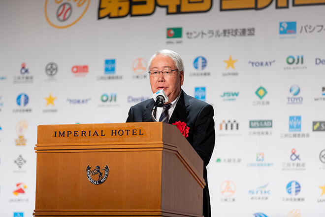 榊原定征コミッショナーの祝辞を代読する日本野球機構・小泉愼一会長特別補佐